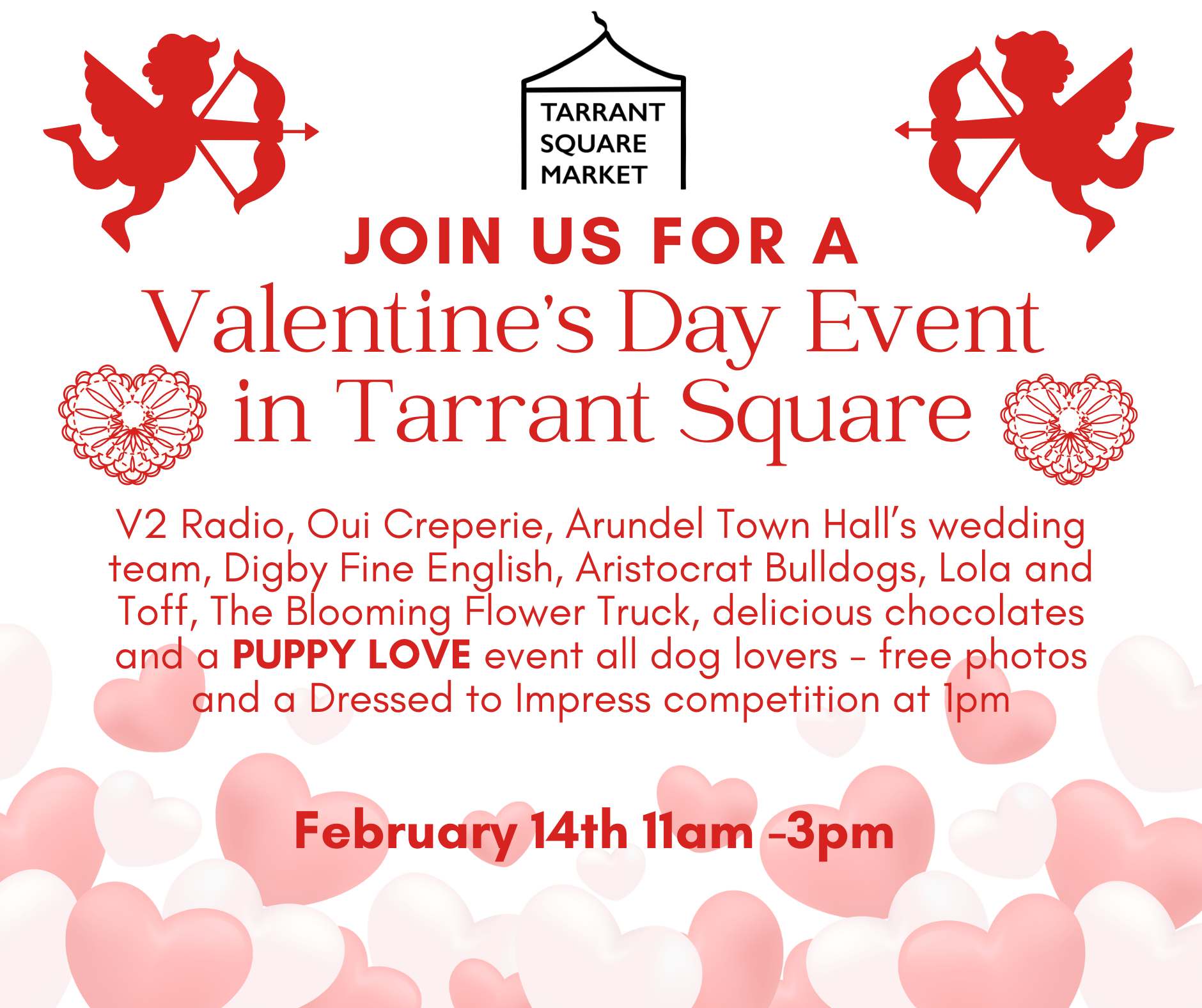 Tarrant Street Market, in partnership with Arundel Town Council, invites everyone to a special Valentine’s Day celebration at Tarrant Square this Saturday, 14th February, from 11:00am to 3:00pm.
